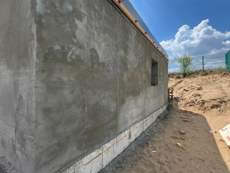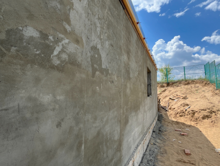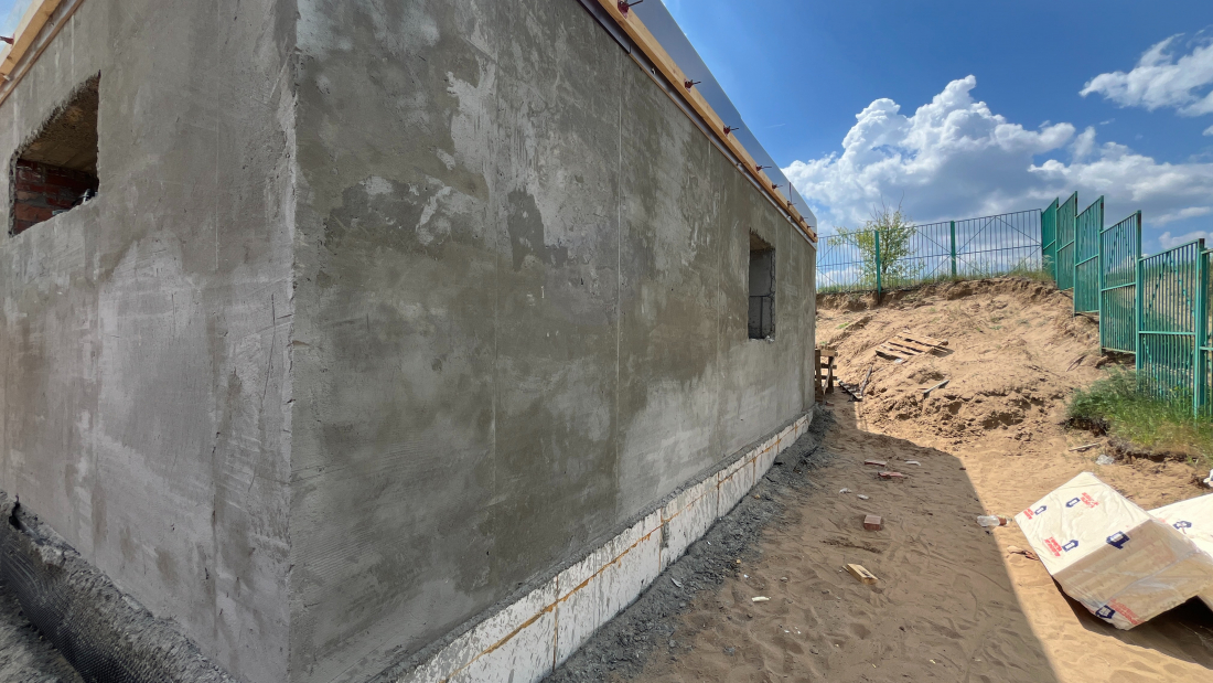 Подготовка под отделку: Проведено наружное оштукатуривание стен, что создает идеальную основу для последующих фасадных работ.