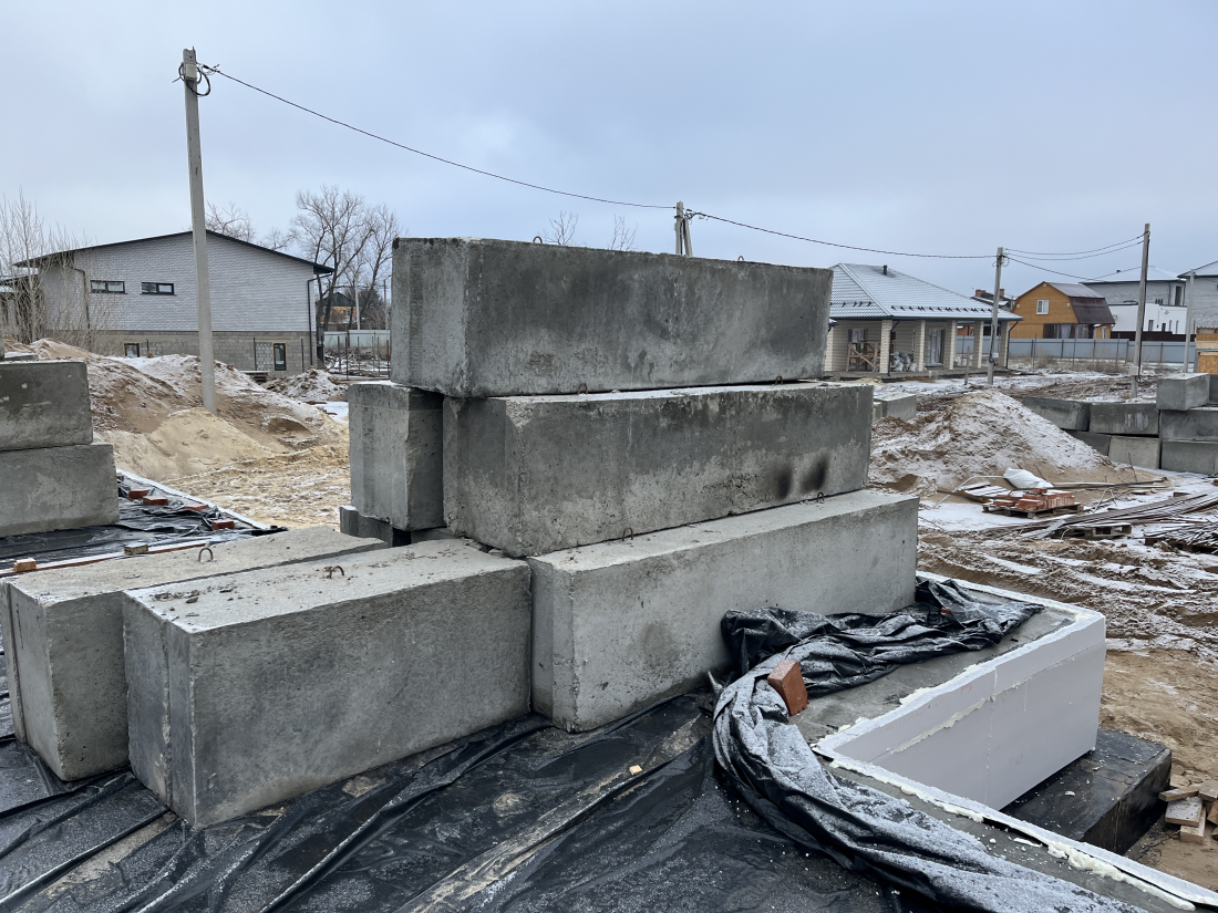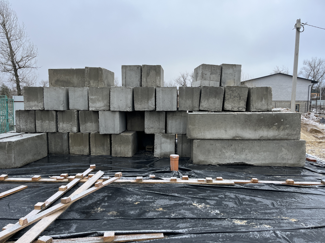 Кладка стен: Возведение конструкций из фундаментных блоков (ФБС) толщиной 500 мм, обеспечивающих высокую прочность и надежность.